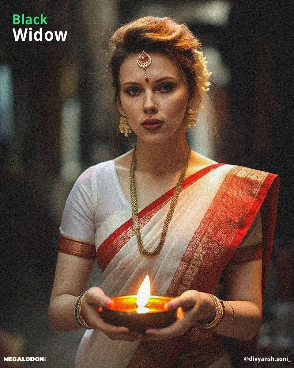 The sassy, powerful and dynamic Black Widow - Scarlett Johansson looks amazing in the desi avatar, reimagined as attending a Durga pandal, befitting the current festive vibe in the country!