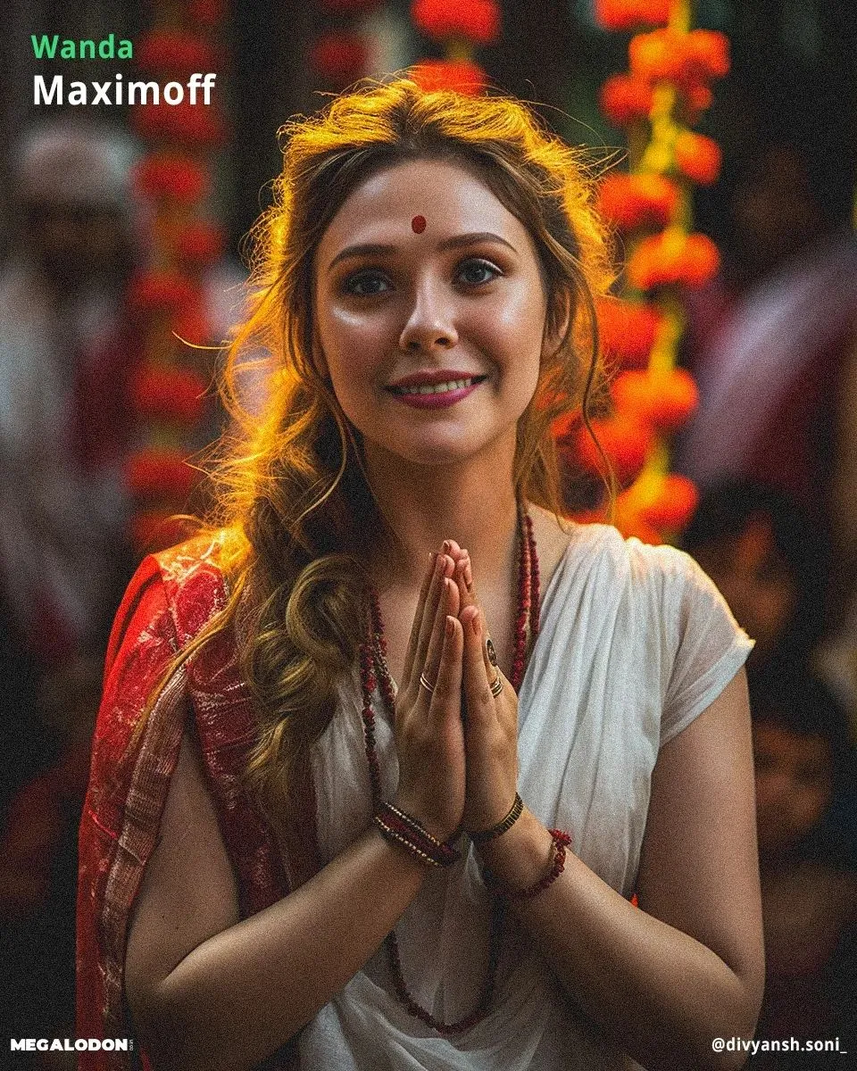Elizabeth Olsen is fitting well in the Durga Puja vibe with her beautiful saree, a perfect nod to her fiery character of Wanda Maximoff in the Marvel Cinematic Universe. Red undoubtedly looks best on the powerful superhero!