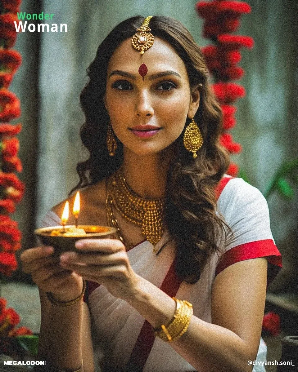 Winning hearts as Wonder Woman is American actress Gal Gadot who looks picture perfect holding a diya, with gold jewellery and the perfect Bengali saree to match the occasion. This stunning AI regeneration will certainly stay with her Indian fans who can now see her rocking the desi look.