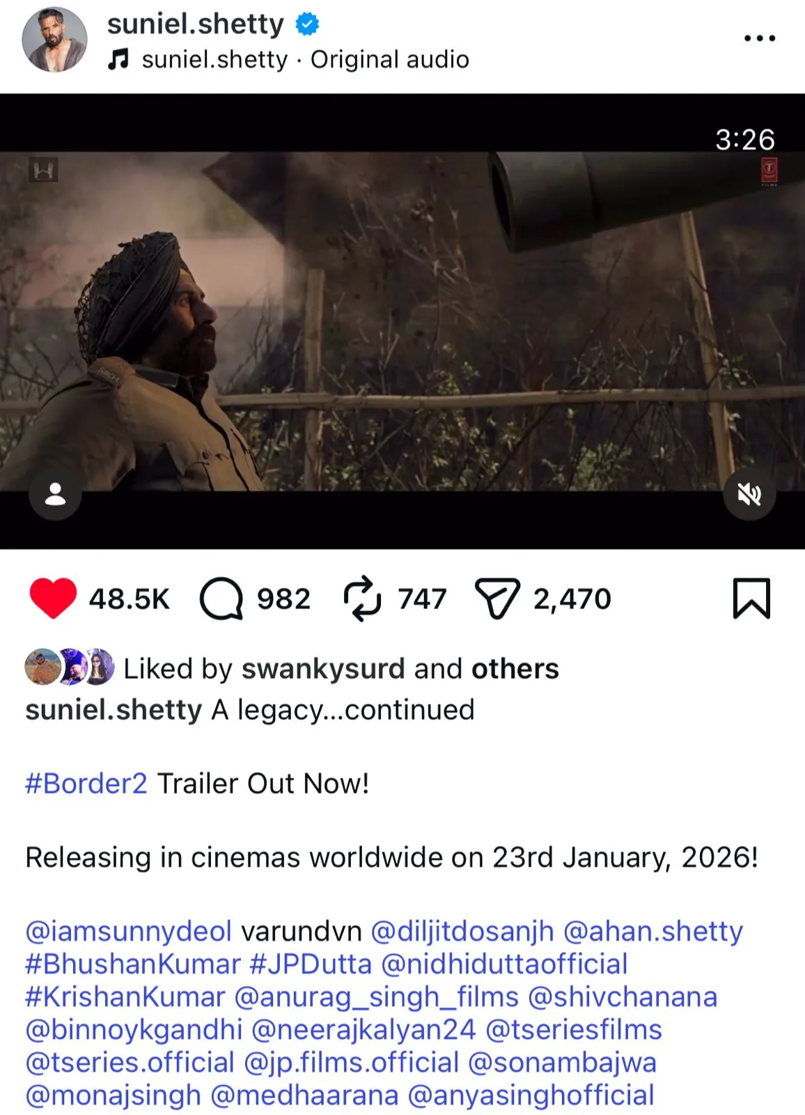 Border 2 is presented by Gulshan Kumar and T-Series. The film is made in association with J.P. Dutta’s J.P. Films. The producers are Bhushan Kumar, Krishan Kumar, J.P. Dutta, and Nidhi Dutta. The film is directed by Anurag Singh. Border 2 will be released in cinemas on 23 January 2026.